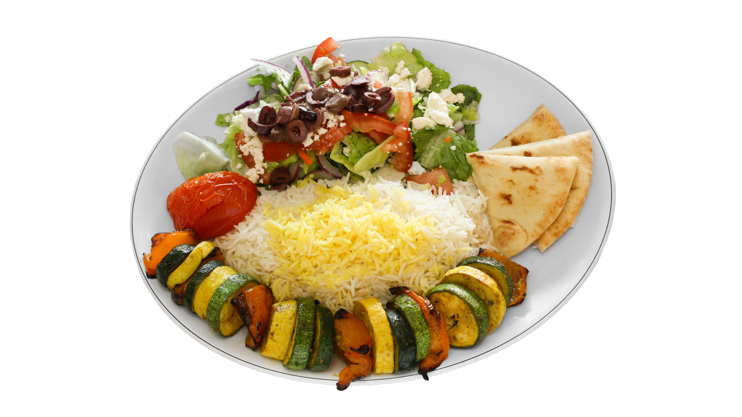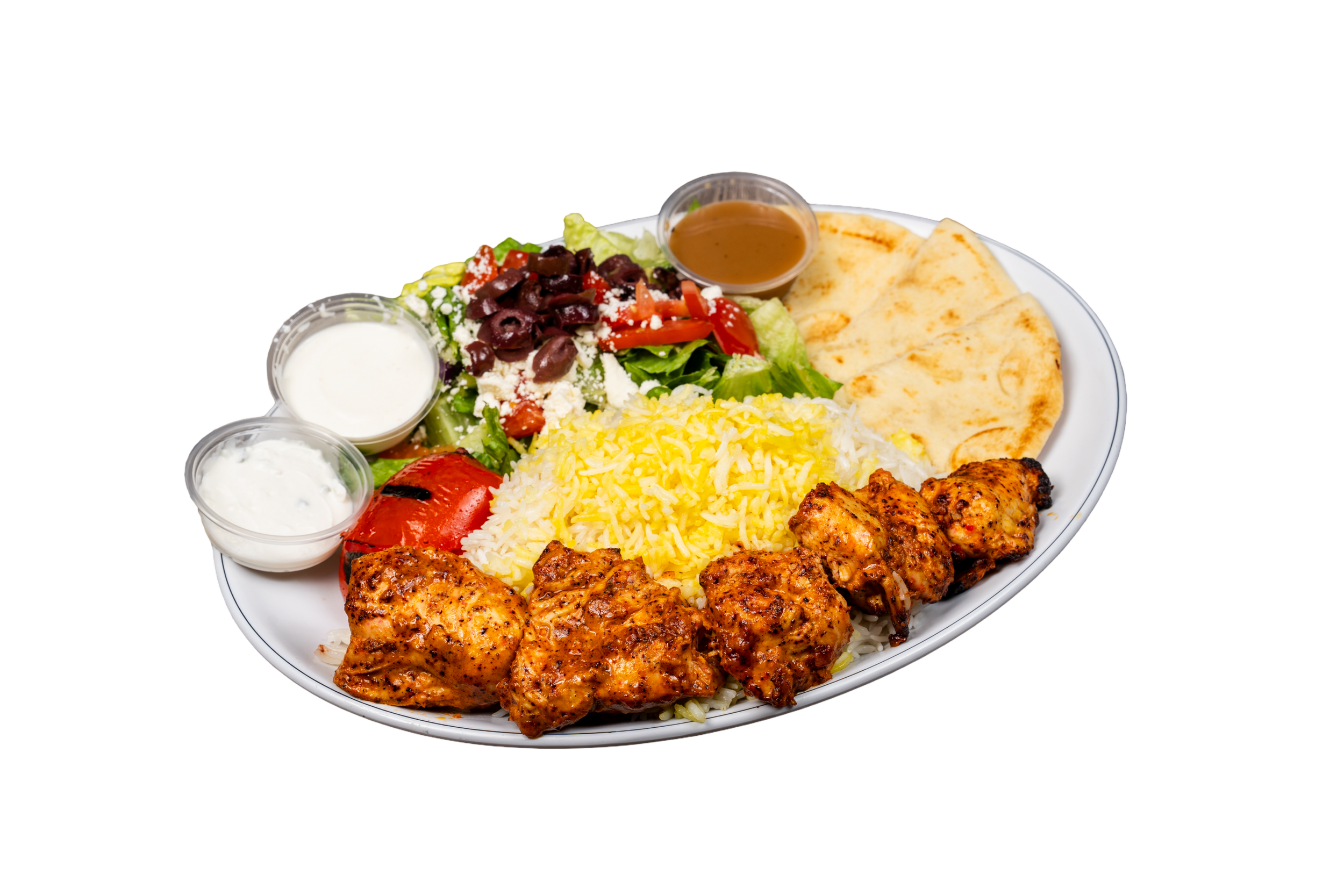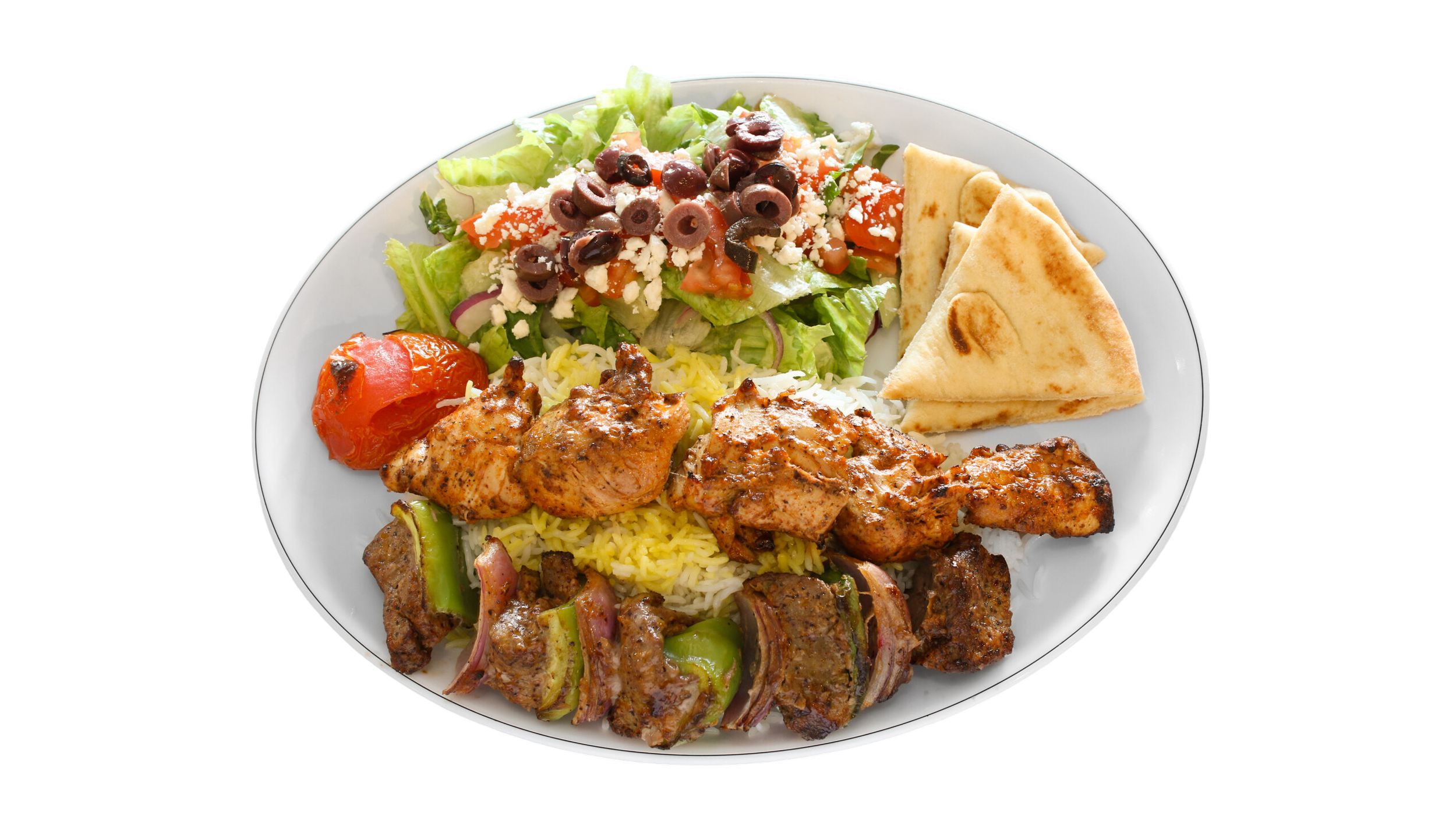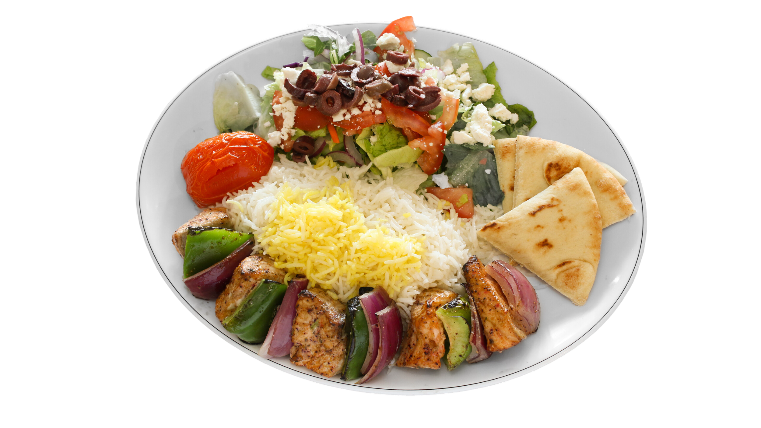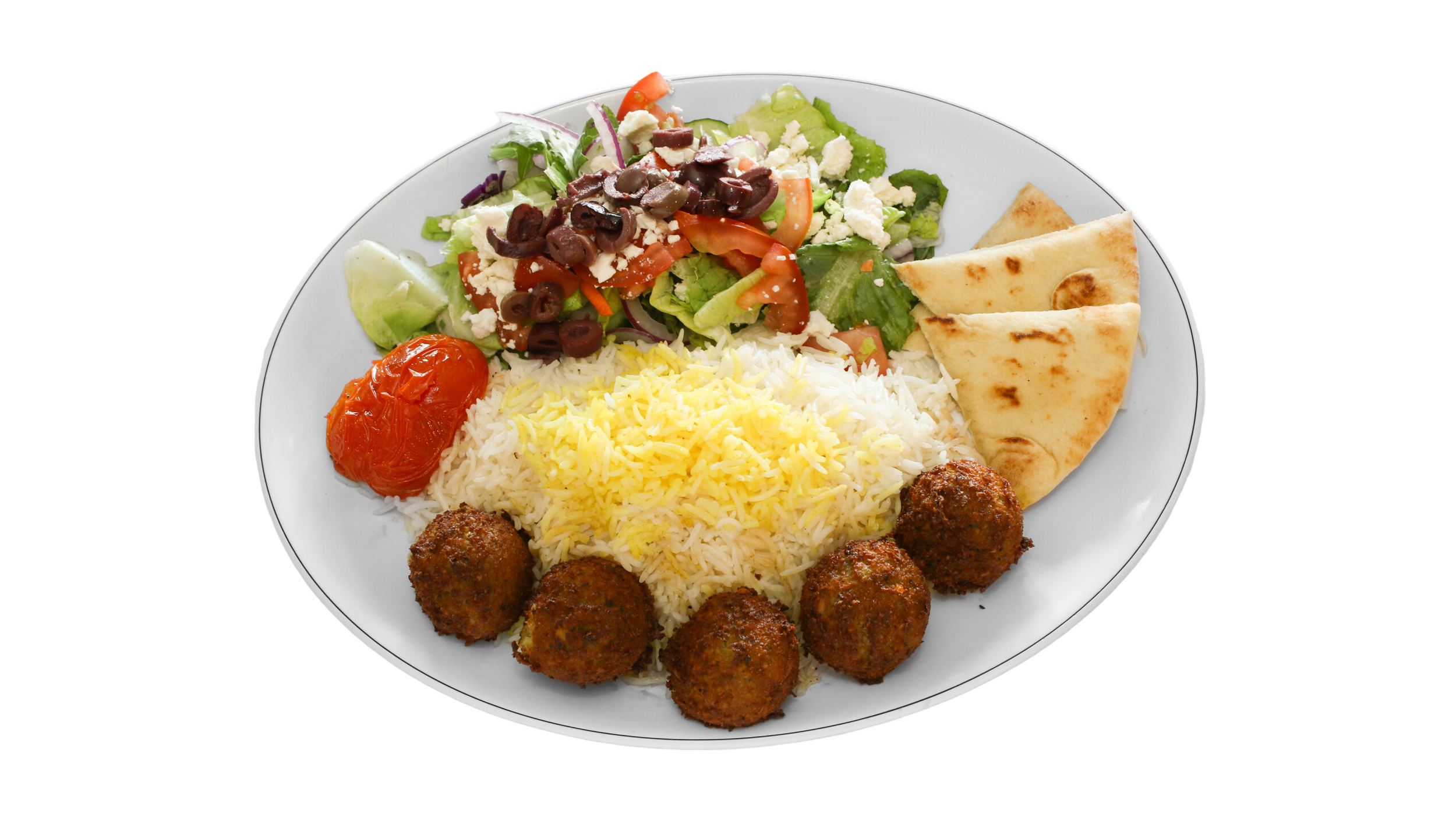 Plates Come with Two Sides, Sides: Basmati Rice, Greek Salad, Hummus, Fries, Babaganoush, 3 Falafels.