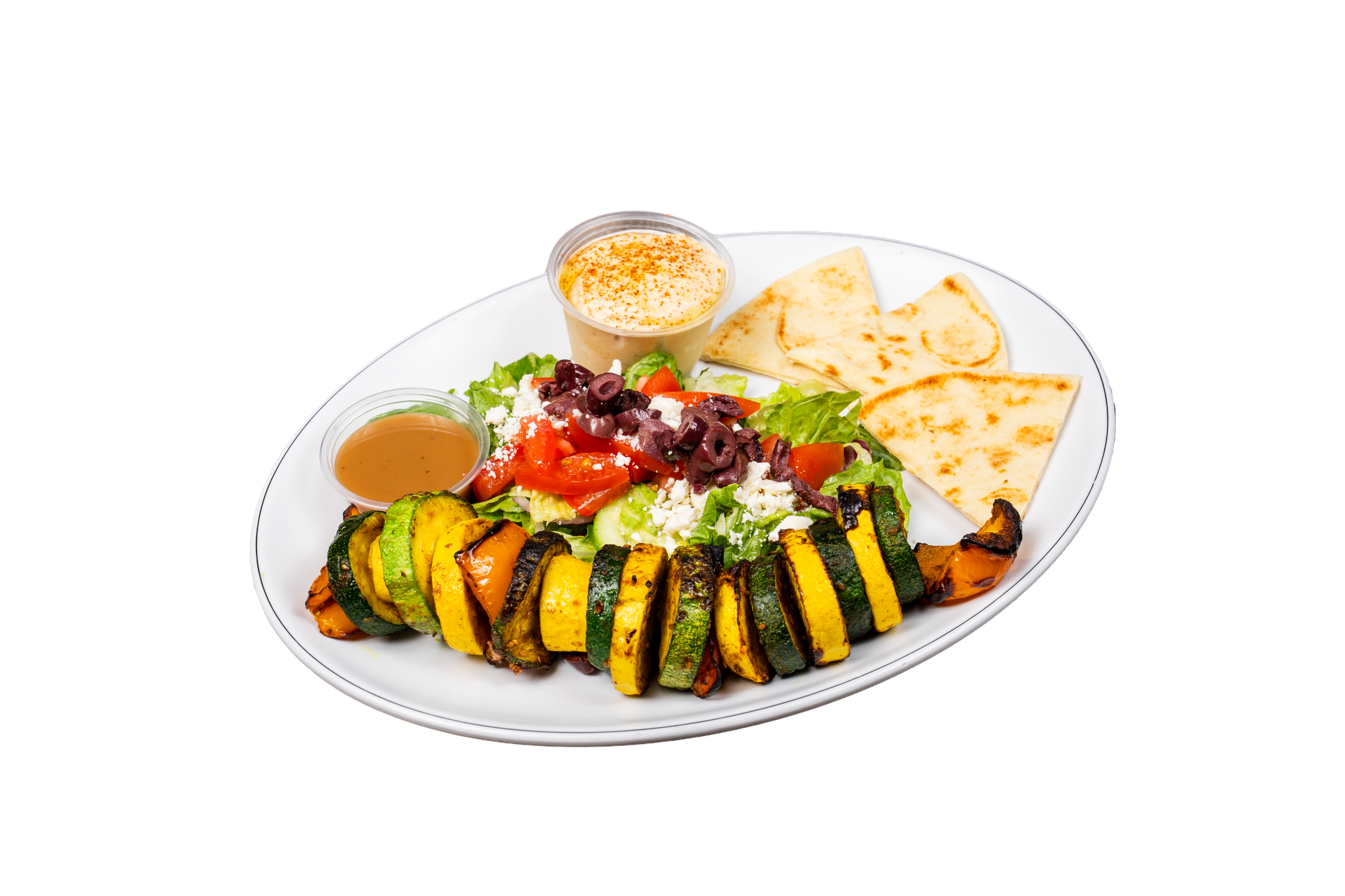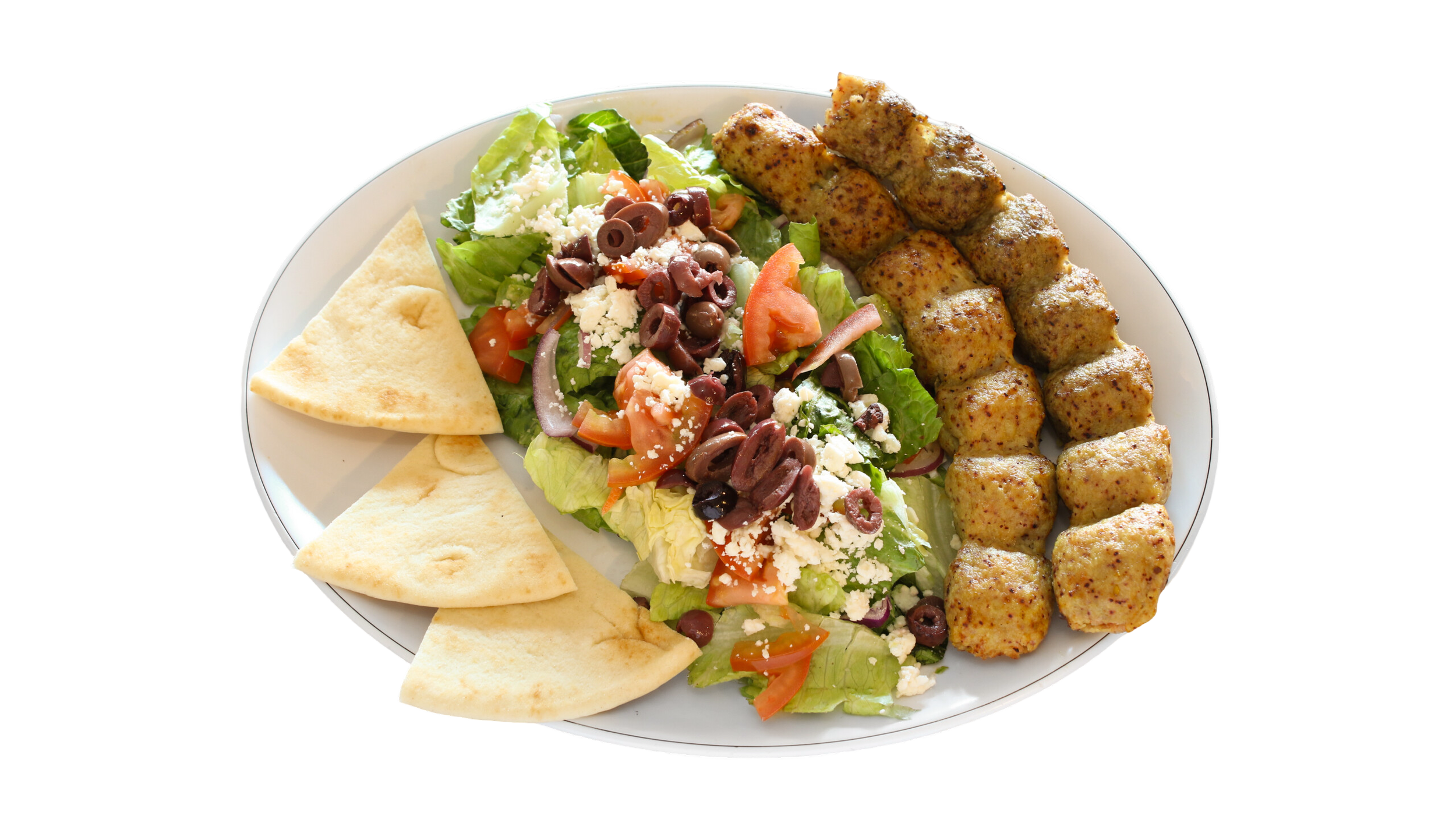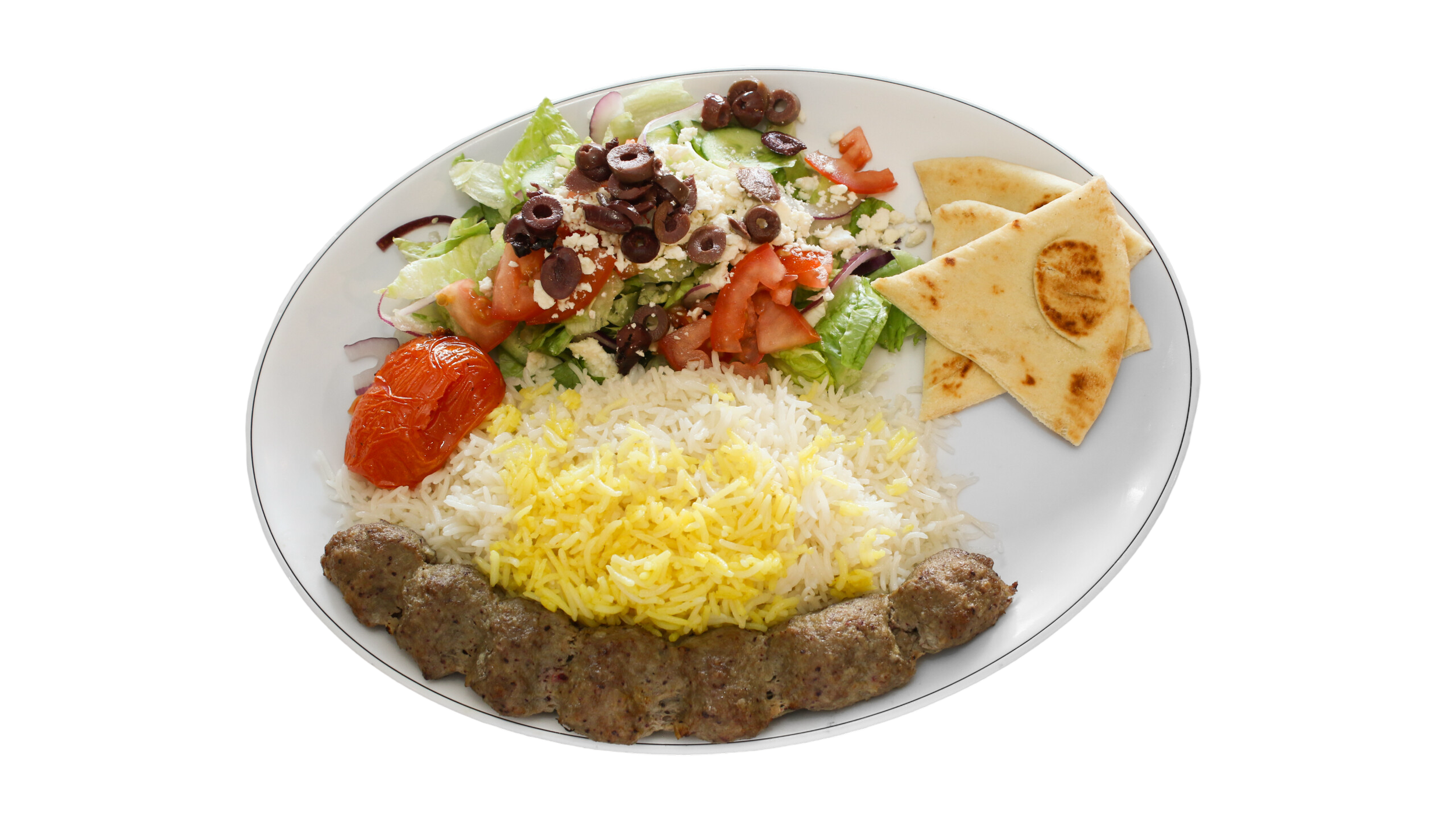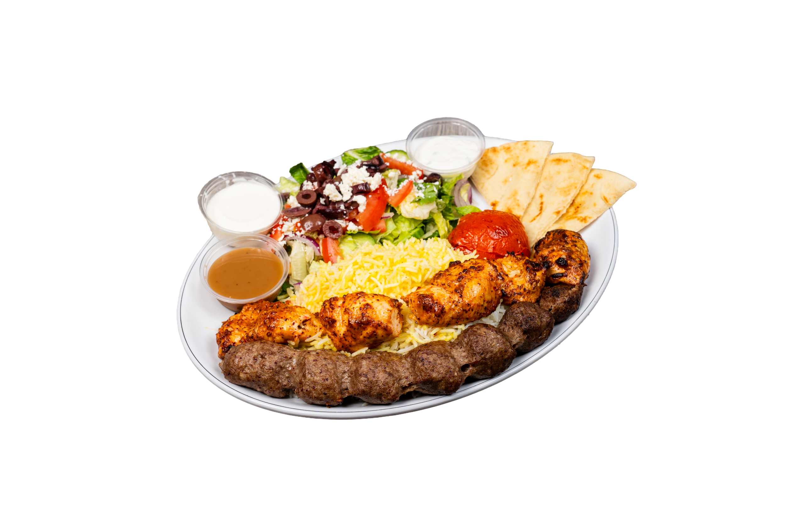 Plates Come with Two Sides, Sides: Basmati Rice, Greek Salad, Hummus, Fries, Babaganoush, 3 Falafels.