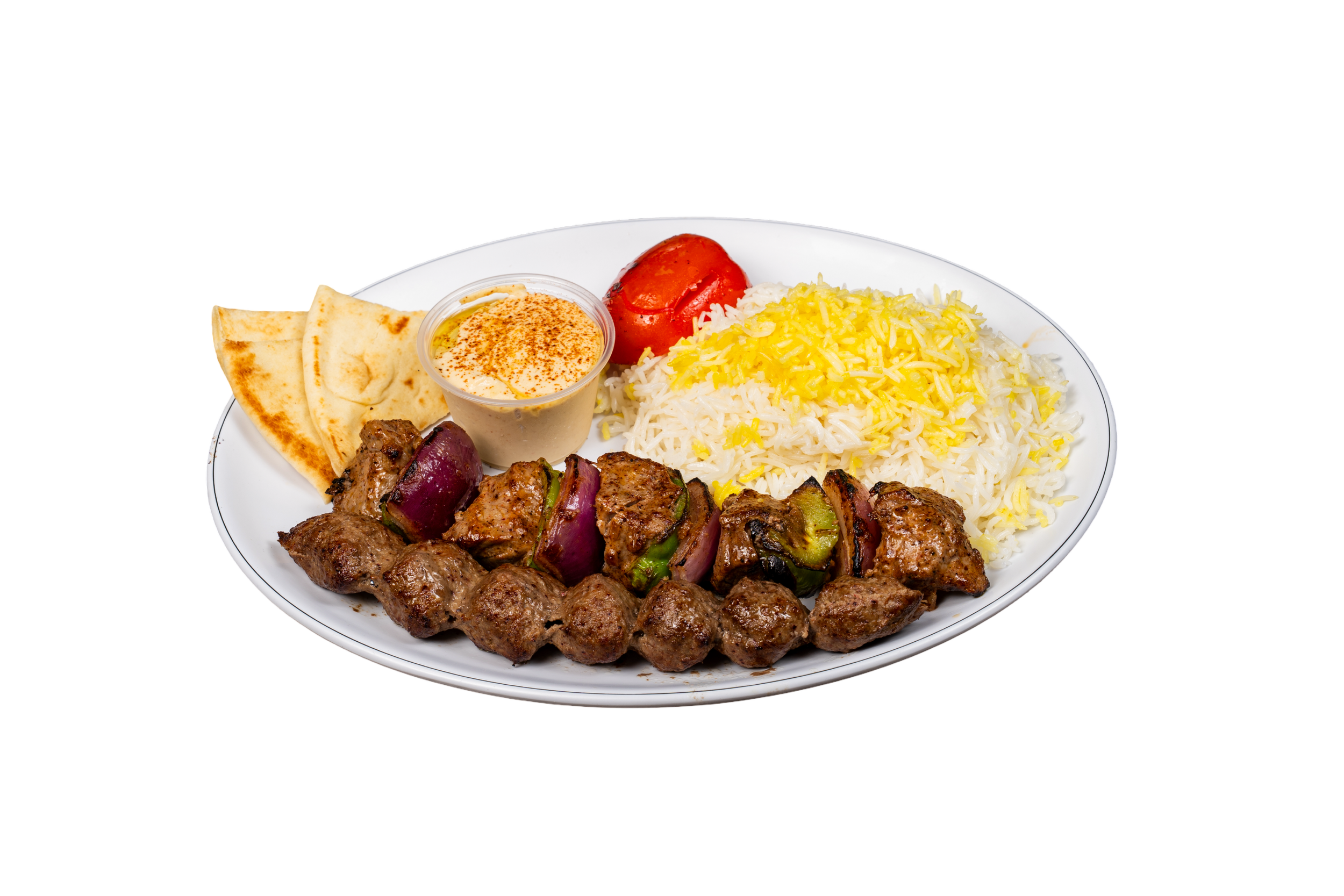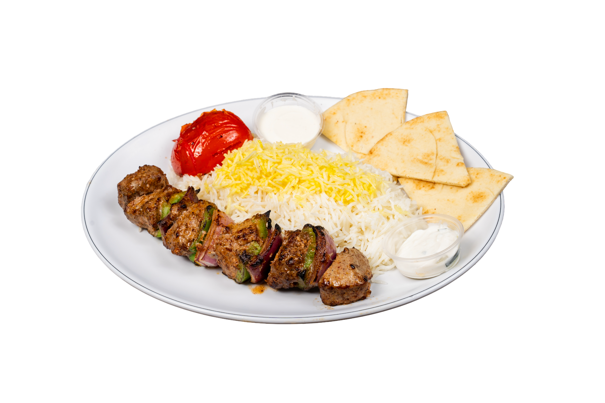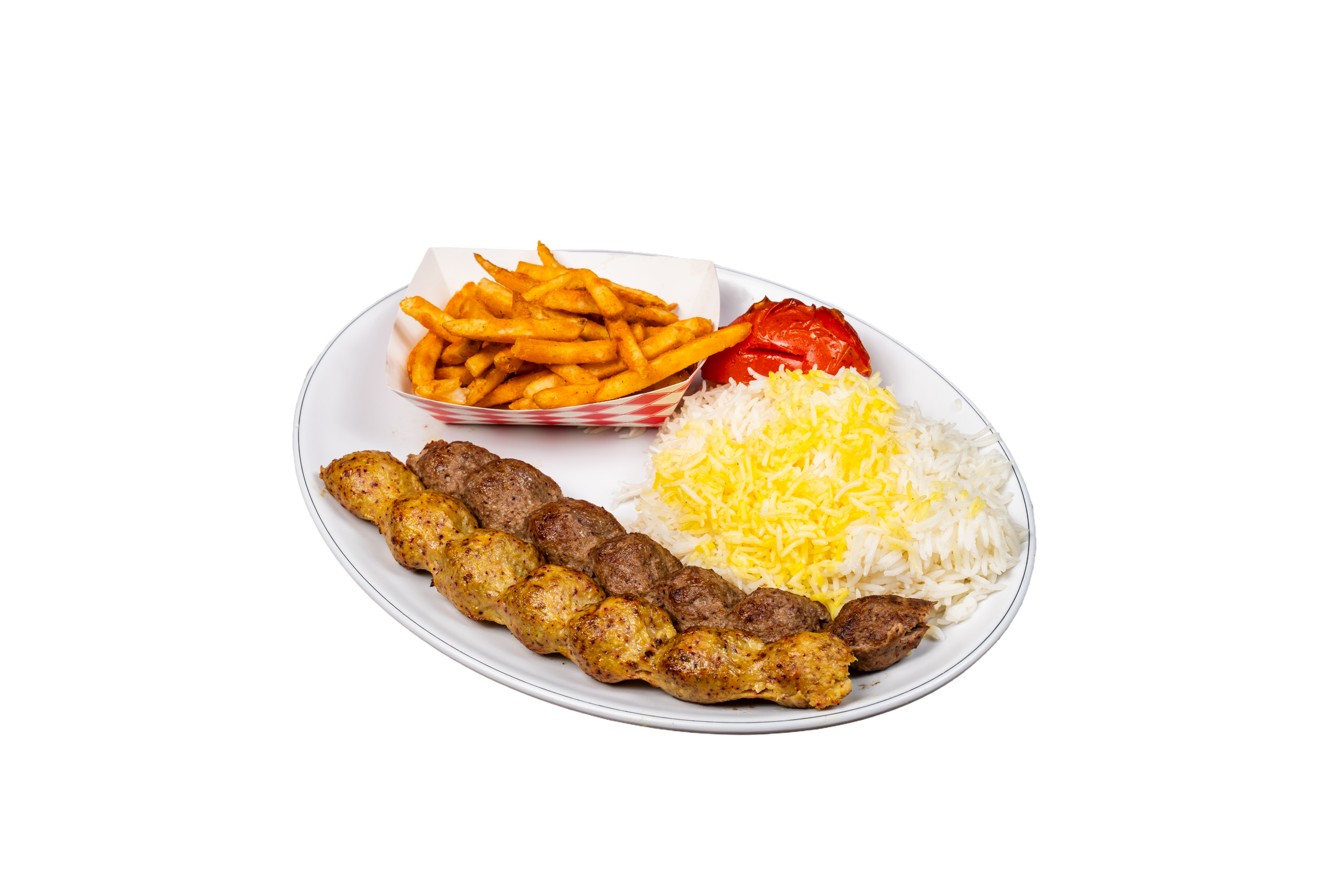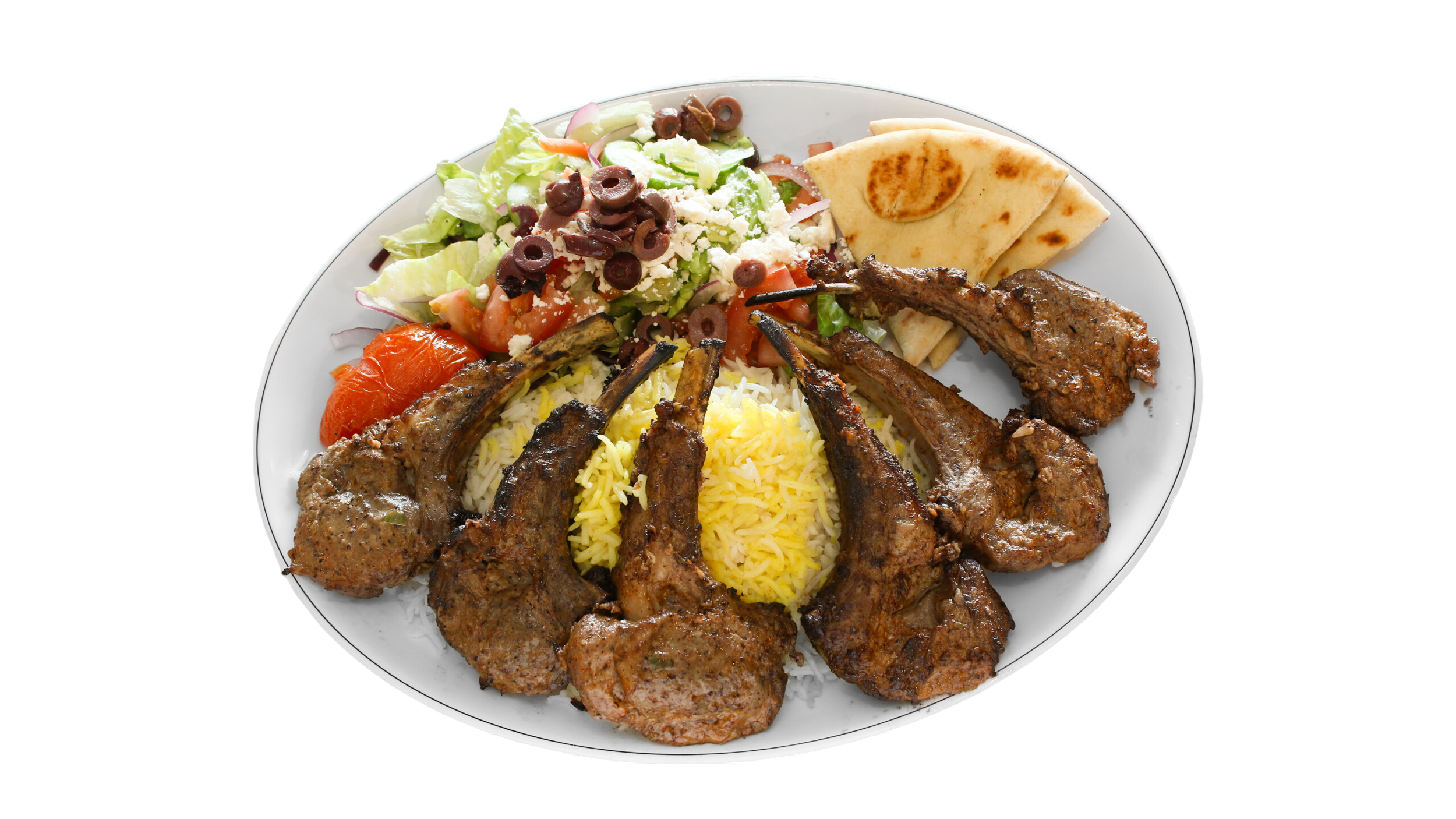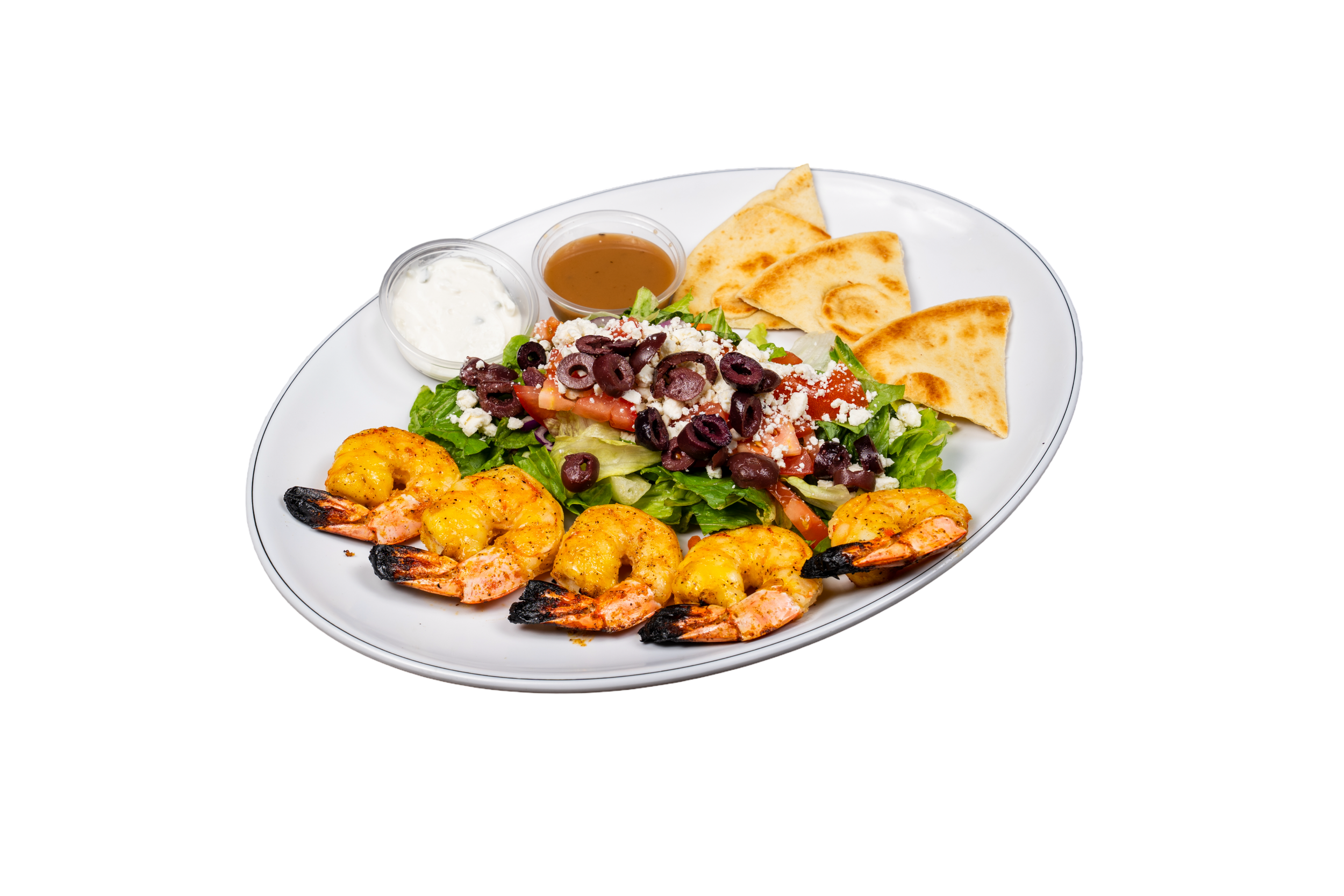 Plates Come with Two Sides, Sides: Basmati Rice, Greek Salad, Hummus, Fries, Babaganoush, 3 Falafels.